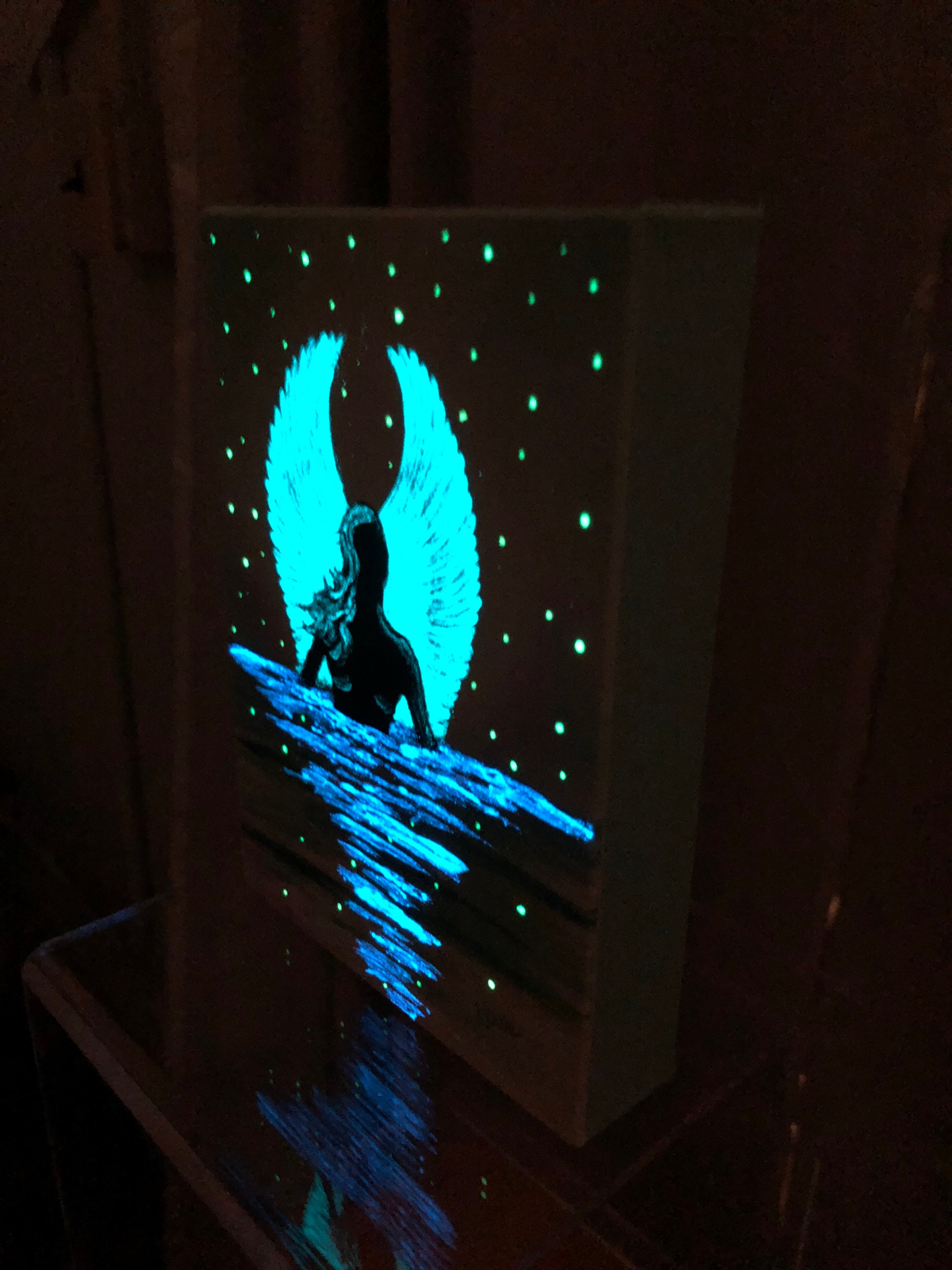 My glow works are a bit of magic and life in a product usually meant to only be enjoyed in the daylight. The glow painting shines the longest and brightest when charged by a UV light. The colors glow beautifully for awhile but fade to a soft blue or green that lasts all night. A black light is included so that you can experience this painting to its fullest.